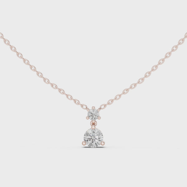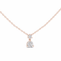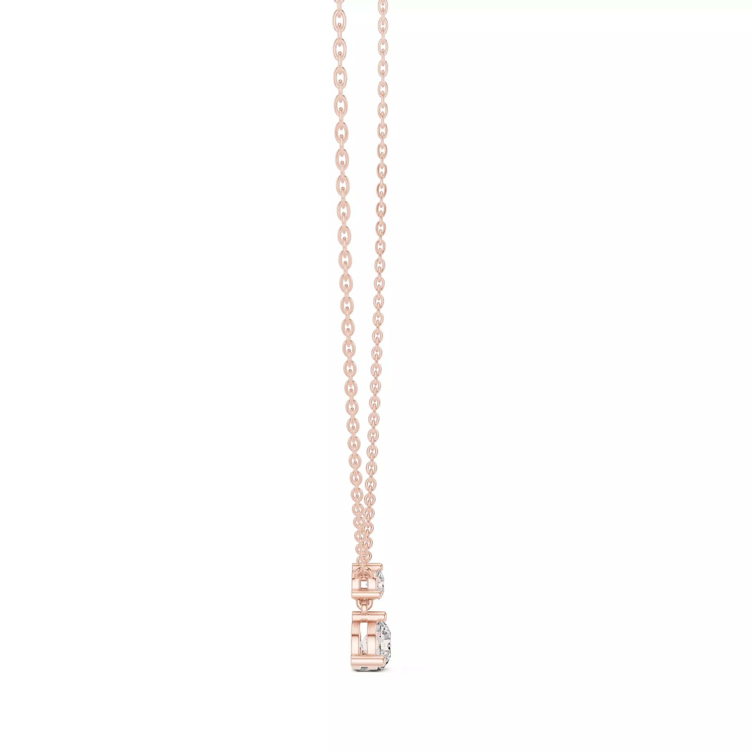 "Вертикалната композиция на модела създава усещане за леко падащ блясък, където горният диамант води погледа към по-големия централен камък. Кръглите шлифовки се подреждат в чиста линия светлина, която остава фина, но изразителна върху деколтето."